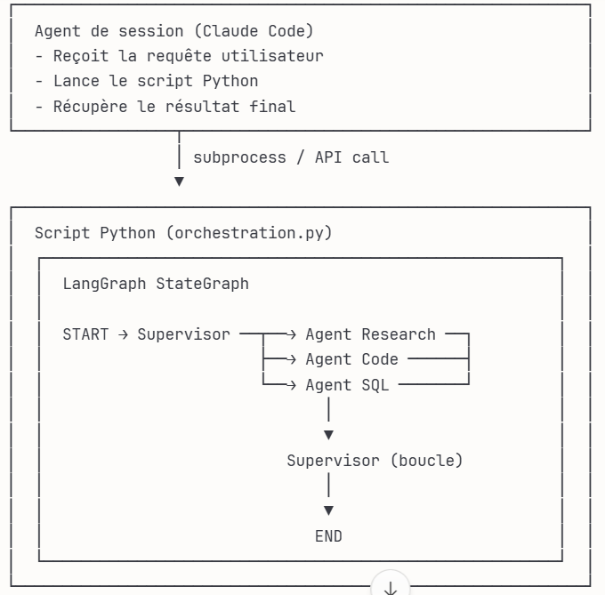 Ton agent de session (Claude Code ou autre) agit comme le point d'entrée qui déclenche l'exécution du programme Python contenant le graphe LangGraph. Ensuite, c'est LangGraph qui prend le relais pour l'orchestration interne.